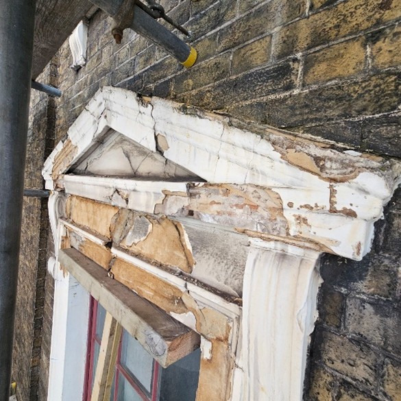 The damaged decorative masonry was thoroughly documented, carefully removed and restored on site in accordance with conservation methods appropriate for a listed building. These measures ensured that the repairs were compatible with the original historic fabric of the property and preserved its architectural integrity.